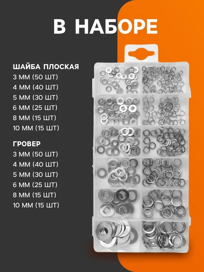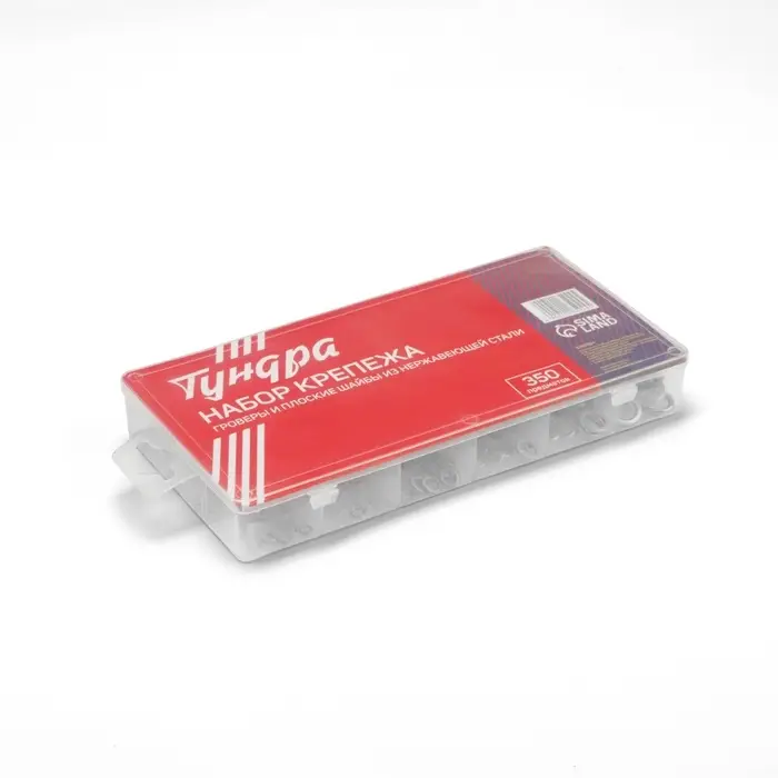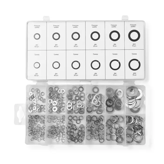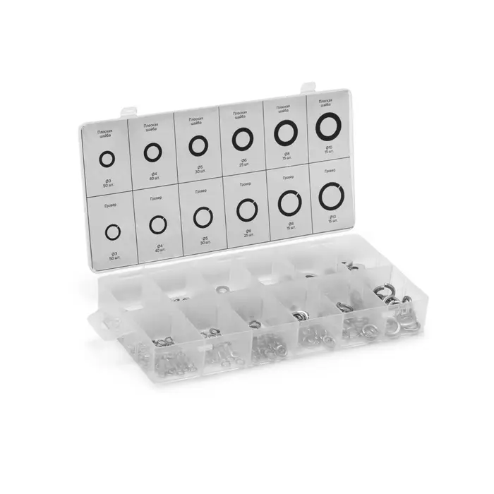 Набор гроверов и плоских шайб ТУНДРА krep (350 шт.) – комплект деталей из нержавеющей стали для укрепления соединений и защиты поверхности при монтаже болтов и гаек.- Гроверы и шайбы: упругие гроверы предотвращают ослабление крепежа, а плоские шайбы равномерно распределяют нагрузку на поверхность.