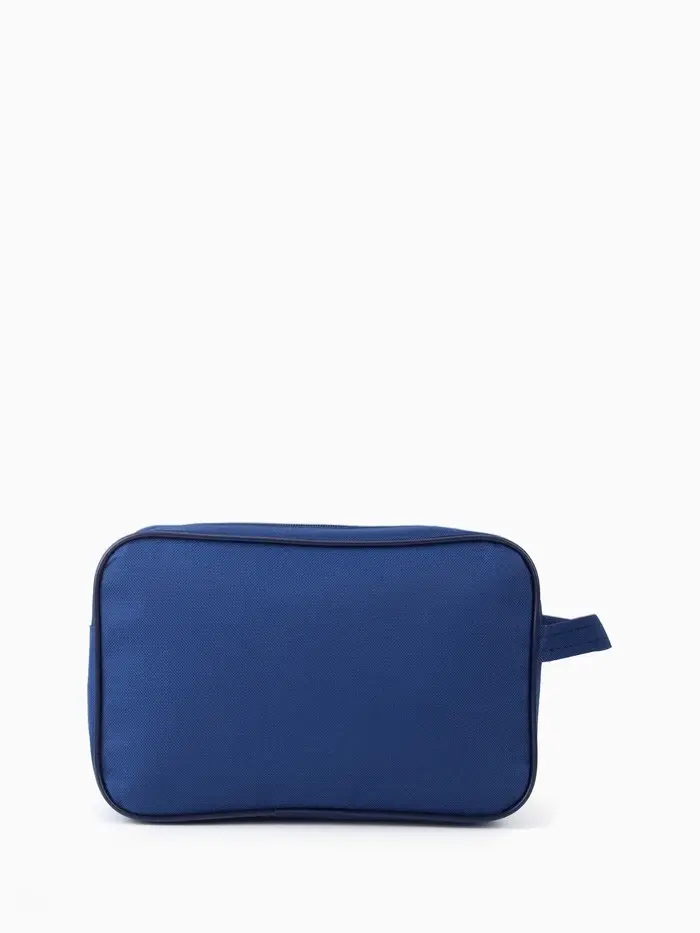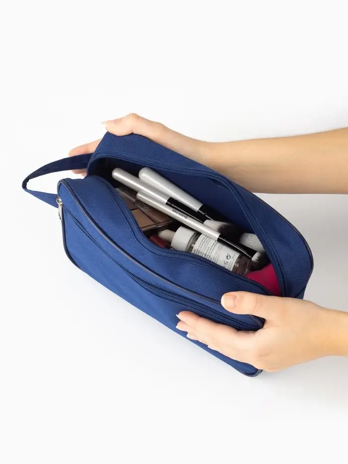 Компактная дорожная косметичка синего цвета с удобной ручкой — практичное решение для хранения туалетных принадлежностей в поездках. Материал косметички обеспечивает лёгкость и износостойкость, а дополнительный карман помогает организовать содержимое.