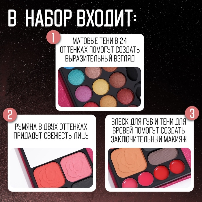 Компактный набор косметики удобно носить с собой, чтобы поправлять макияж в течение дня. Также его можно преподнести в качестве подарка на любой праздник благодаря яркому дизайну. Набор имеет удобную форму и широкий выбор средств для макияжа:
