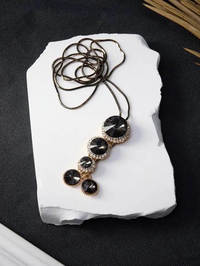 Эта изящная жемчужина гармонично сочетает в себе богатство винтажных мотивов и современные элементы стиля. Серый оттенок и золотистая фурнитура создают эффектный контраст, привлекая внимание и подчеркивая индивидуальность каждой женщины, предпочитающей утонченную элегантность. Длина цепочки в 85,5 см позволяет красиво подчеркнуть шею и декольте, делая образ завершенным и стильным.