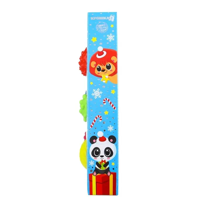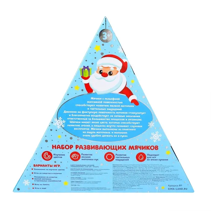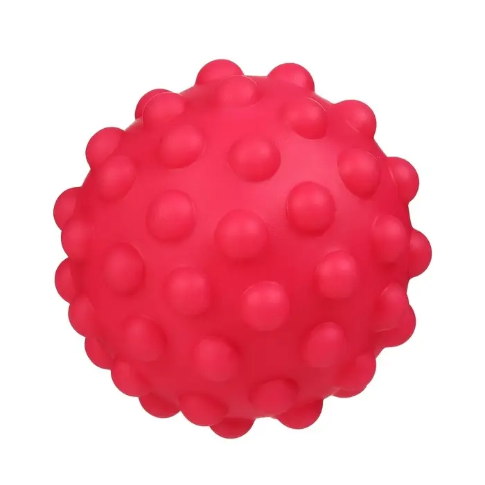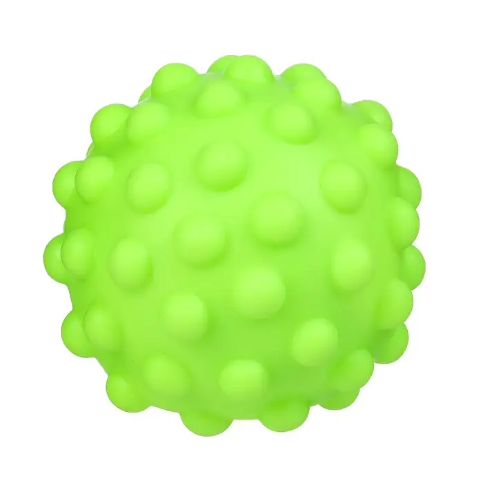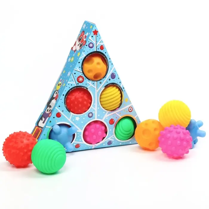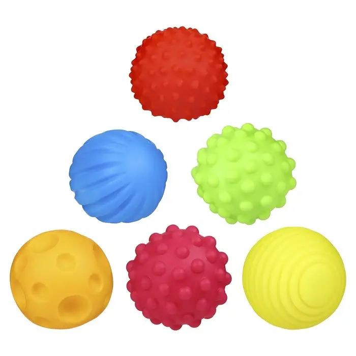 Мячики с рельефной массажной поверхностью способствуют развитию мелкой моторики и тактильных ощущений. Давление на фактурную поверхность мячиков стимулирует и благоприятно воздействует на нервные окончания, ответственные за большинство процессов в организме. Шарики имеют яркие цвета, которые способствуют развитию зрения, а пищалка внутри развивает слуховое восприятие.