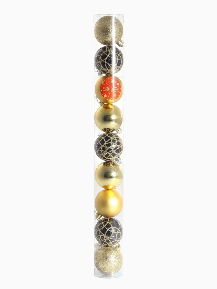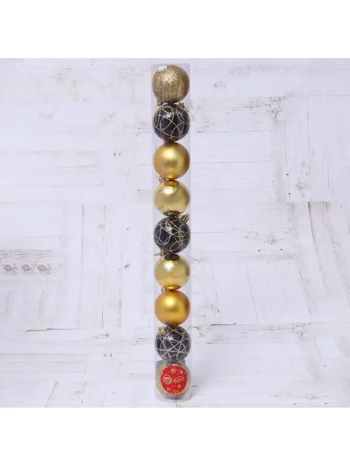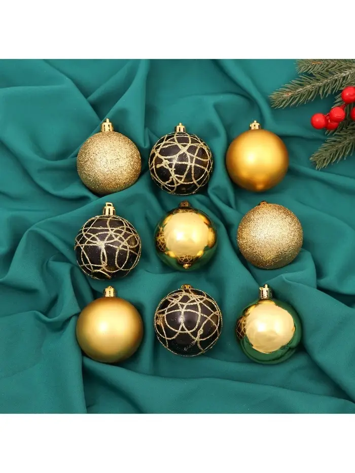 Эти шары создают образ Нового года, где важны не яркие краски, а баланс света и формы. Золотые и тёмные тона добавляют дереву благородства, но остаются в рамках классической зимней эстетики. Используйте игрушки как основу или как часть уже существующей композиции — они одинаково хорошо работают в разных интерьерах и тематиках праздника.