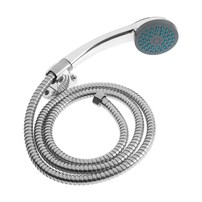 В комплект входят душевая лейка, шланг и держатель. Лейка имеет круглую форму и выполнена из ABS-пластика. Шланг изготовлен из нержавеющей стали, крепится на гайки. Настенный кронштейн для лейки — неповоротный.