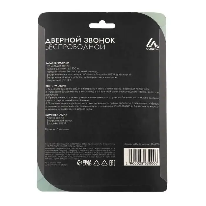 Электрический дверной звонок Luazon LZDV-33 – это современное и полезное устройство для вашего дома. Звонок подойдёт для установки в квартире или доме: радиус действия в 100 м позволяет использовать его на большой территории. Среди остальных устройств дверные звонки Luazon выделяются за счет следующих преимуществ:
