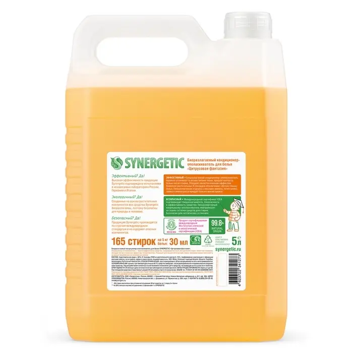 Биоразлагаемый кондиционер-ополаскиватель для белья SYNERGETIC "Цитрусовая фантазия" – высокоэффективное средство, бережно ухаживающее за всеми типами ткани, в том числе деликатными, и придающее особую мягкость и нежность белью после стирки.