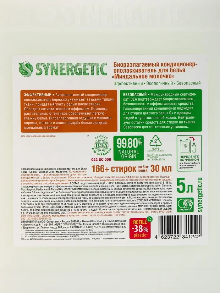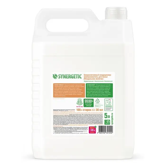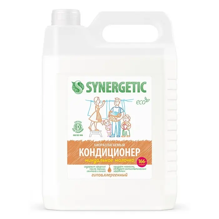 Биоразлагаемый кондиционер-ополаскиватель для белья SYNERGETIC "Миндальное молочко" – высокоэффективное средство, бережно ухаживающее за всеми типами ткани, в том числе деликатными, и придающее особую мягкость и нежность белью после стирки.
