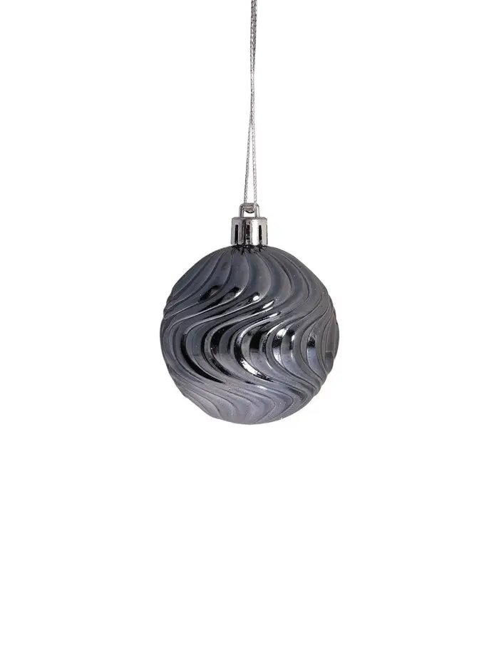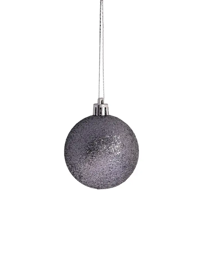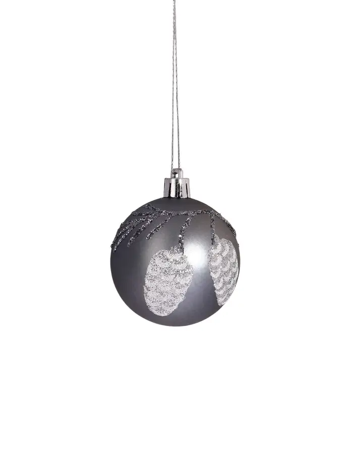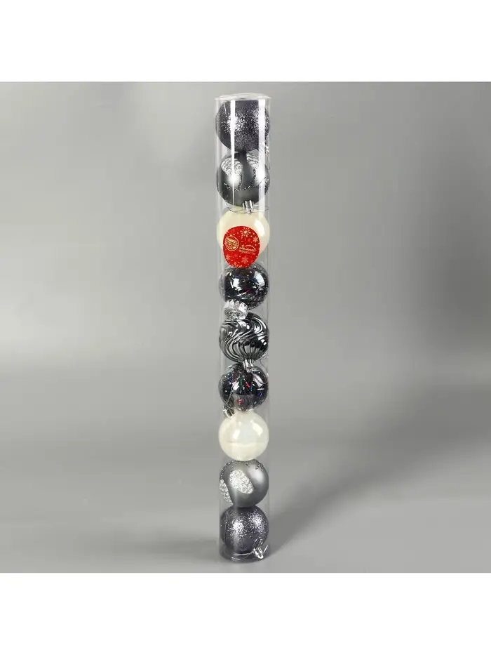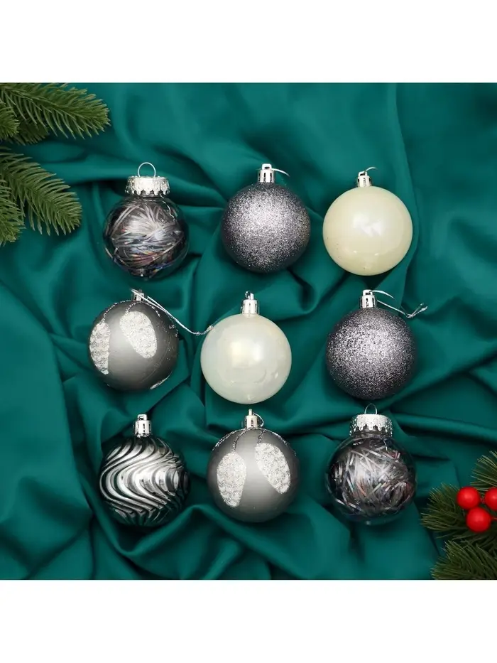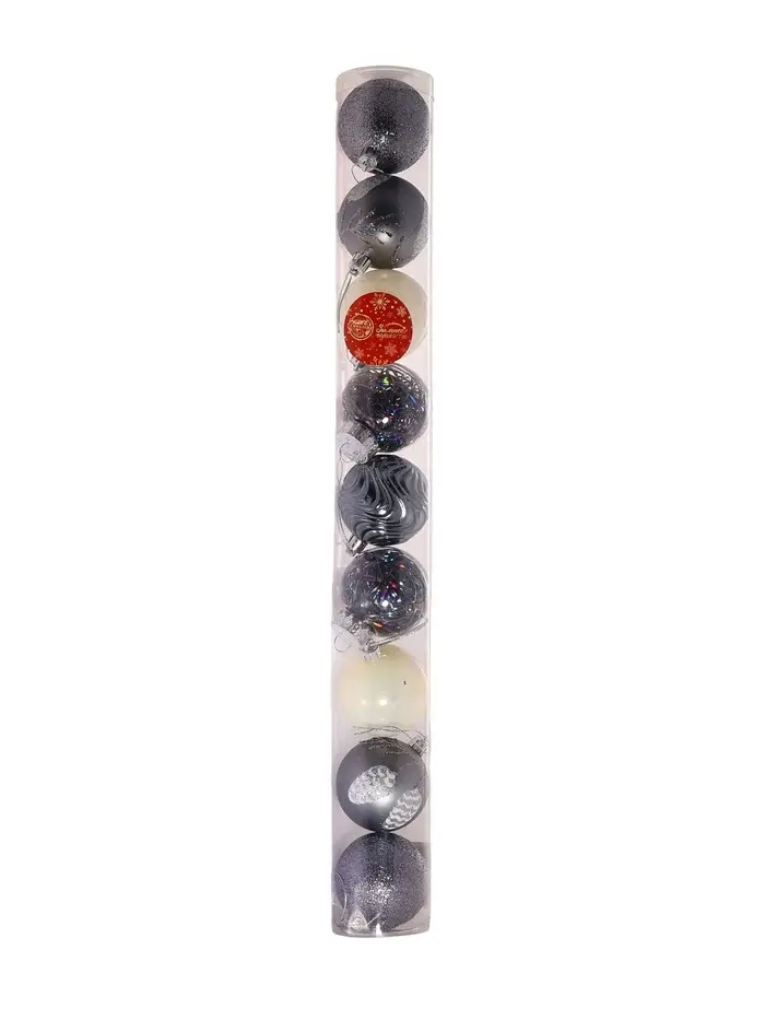 - Девять шаров с разнообразным дизайном в оттенках серого, белого и серебристого.