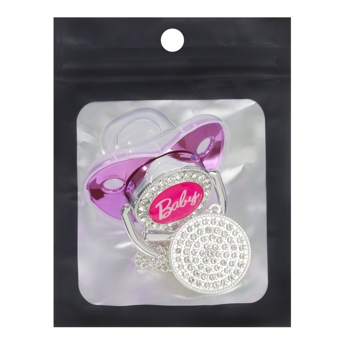Соска - пустышка силиконовая ортодонтическая «BABY», от 6 мес., с колпачком + держатель - цепочка, цвет розовый/серебло, стразы