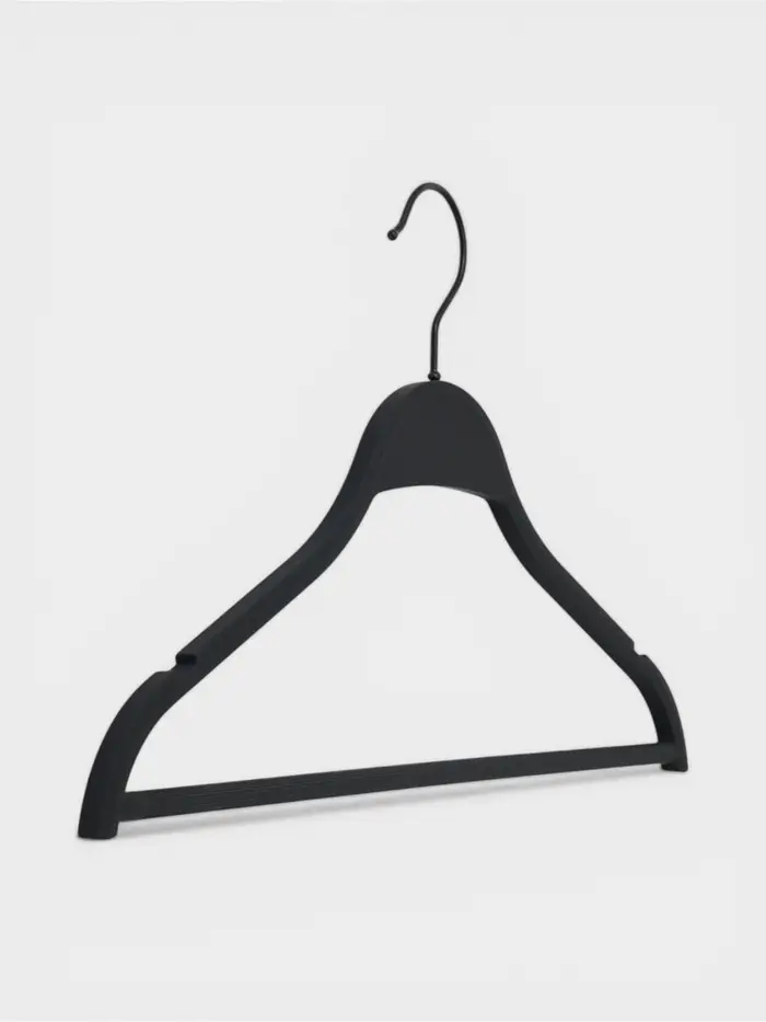 Конструкция объединяет два типа вешалок в одном. Верхняя часть с анатомическим изгибом поддерживает форму плеч у пиджаков и блузок, а нижняя перекладина с мягким покрытием бережно фиксирует брюки, предотвращая появление стрелок. Это решение особенно удобно для офисной одежды или подобранных комплектов — весь образ хранится вместе. Поворотный крючок позволяет развернуть вешалку вдоль шкафа, что значительно увеличивает полезную вместимость гардероба. В итоге вы тратите меньше времени на подбор вещей и поддержание порядка.