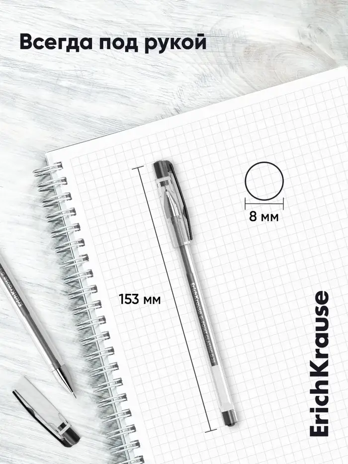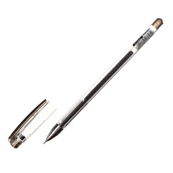 - Неавтоматическая гелевая ручка с чёрным стержнем и защитным колпачком.