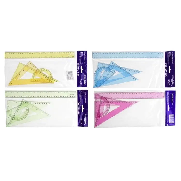 В комплекте: линейка 30 см, 2 треугольника, транспортир.