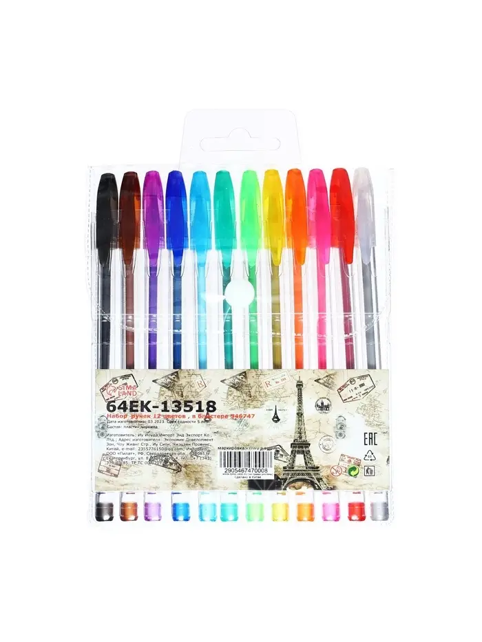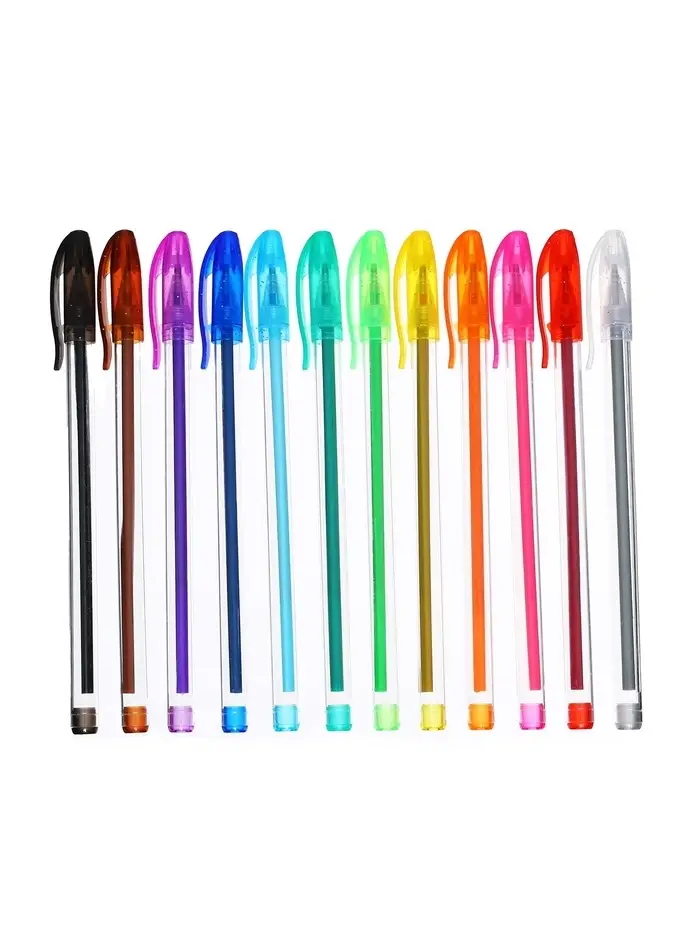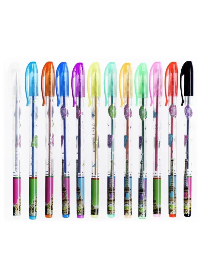 Этот набор из двенадцати гелевых ручек — ваш ключ к заметным записям и ярким акцентам. Каждый из двенадцати металлических оттенков вносит на страницу не просто цвет, а глубину и лёгкий блеск. Блистер с кнопкой сохраняет порядок и даёт удобный доступ ко всем цветам сразу.