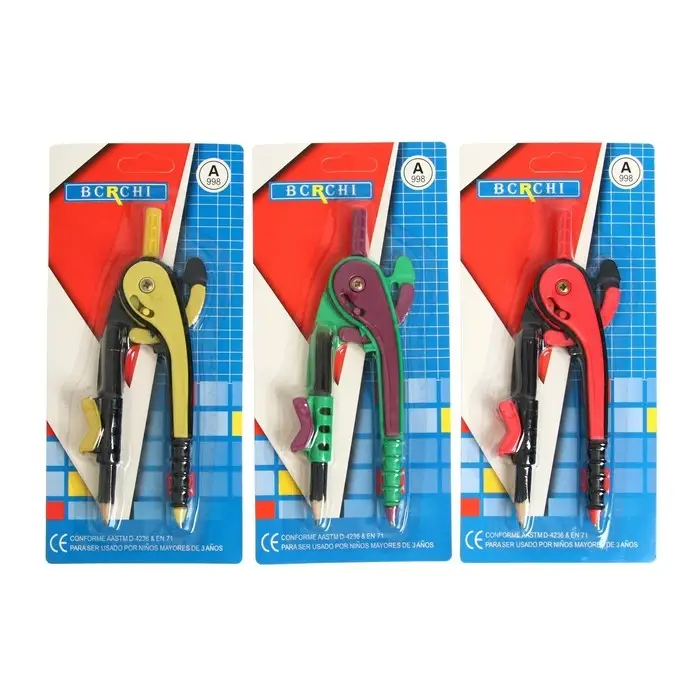 - В набор входят два предмета: пластиковый циркуль диаметром 145 мм и карандаш.