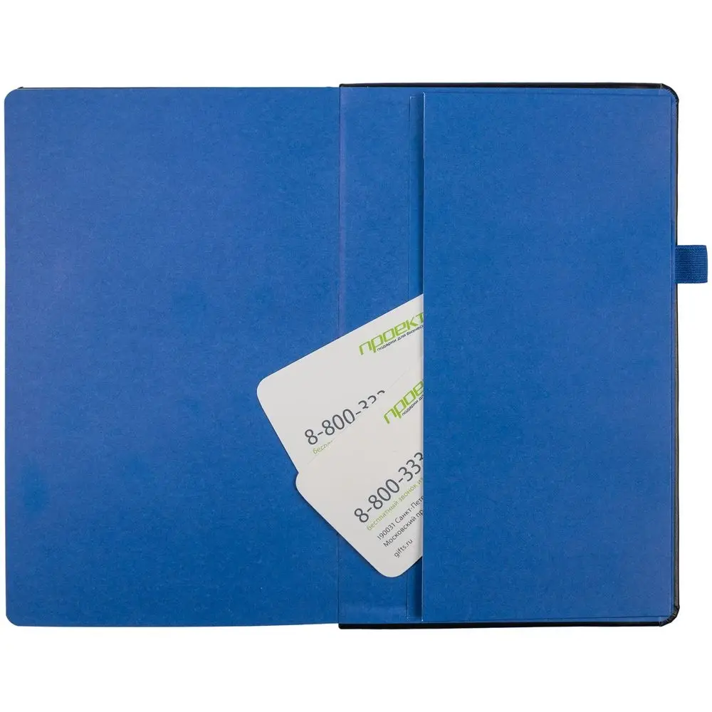 Ежедневник с полутвердой обложкой, выполнен из материала Waltz, черный АА, дополнен синей резинкой с металлическим шильдом и ляссе.