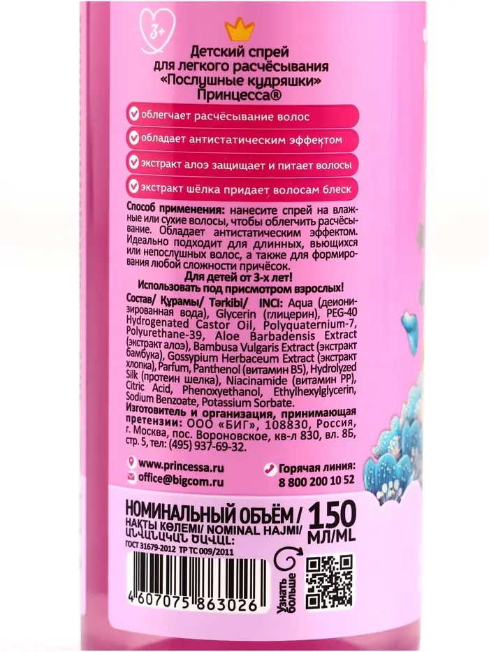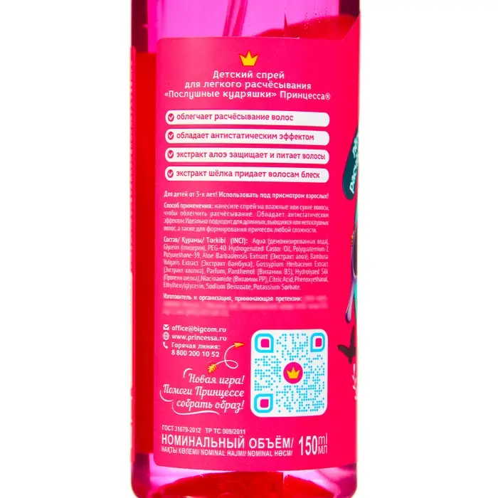 Спрей для волос детский «Принцесса», лёгкое расчёсывание. послушные кудряшки, 150 мл