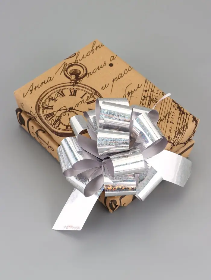 - Голографический эффект – серебро с характером: При повороте бант отливает сиреневым, голубым и золотым. Остаётся нейтральным фоном для цветной упаковки или ярким акцентом на чёрной коробке.