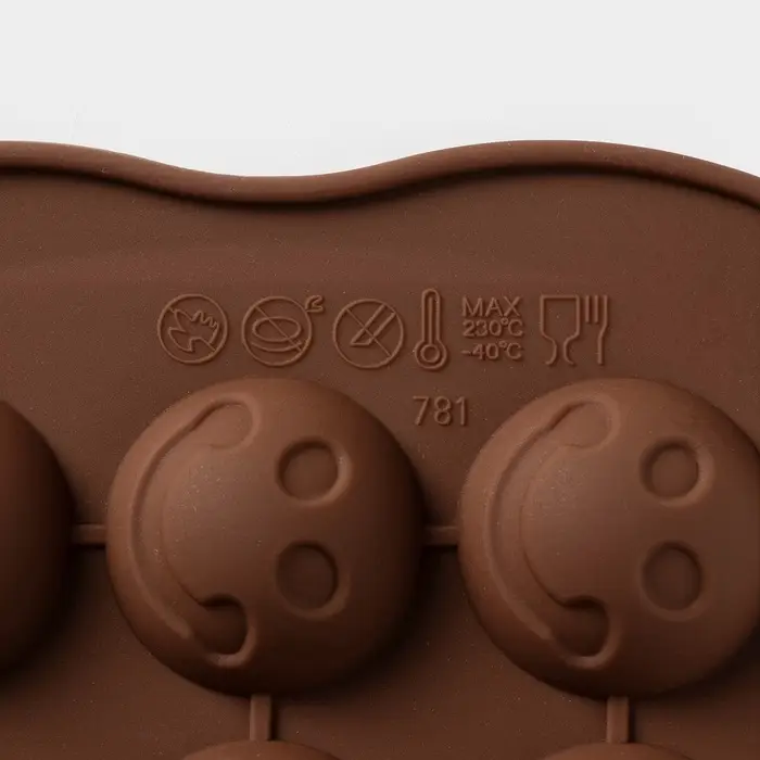 Силиконовая форма «Шарик смайл» — простой способ добавить хорошего настроения в домашние сладости. В ней 15 круглых ячеек с объёмным силуэтом улыбающегося смайла: без рисунков, но с выразительной формой. Коричневый силикон подчёркивает детали, а прямоугольный формат (20×10 см) удобно размещается в морозилке или на противне.