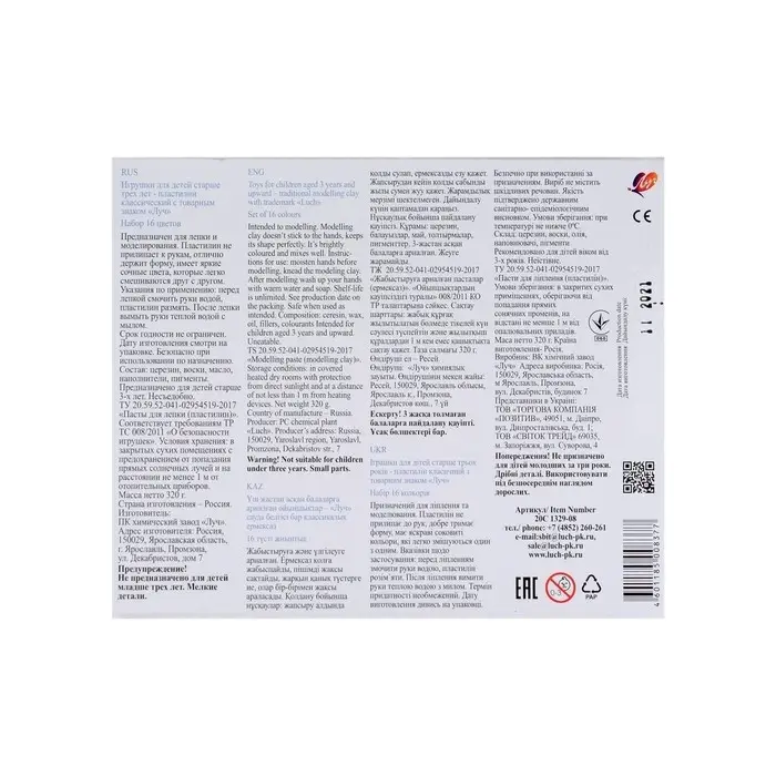 Пластилин «Луч. Классика цвета», 16 цветов, 320 г