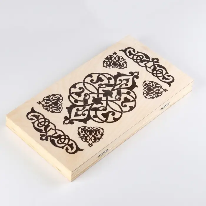 Рисунок на нардах нанесен методом прямой печати по дереву. Внутренняя часть кейса - игровое поле для самой игры в нарды, одна из внешних сторон кейса - игровое поле для игры в шашки и шахматы.