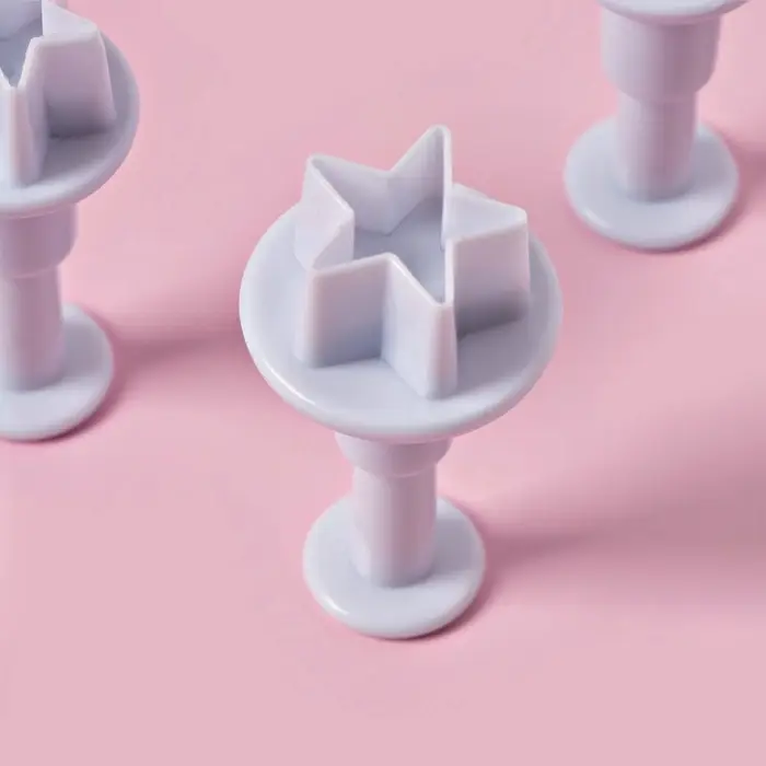 Набор плунжеров «Звёздочка» — три белых пластиковых штампа для точечного декора. Подходят для отпечатков в тесте, марципане, мастики или шоколаде. Каждый размер — 2 см, 2,2 см, 2,5 см — даёт контроль над масштабом: от акцентов на прянике до звёздной композиции на торте. Без рисунка, без покрытия — только чистая форма, которая не отвлекает от сути.