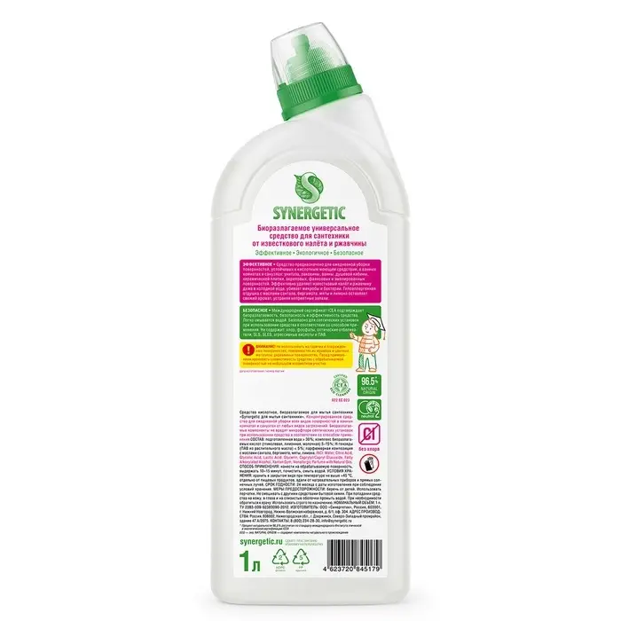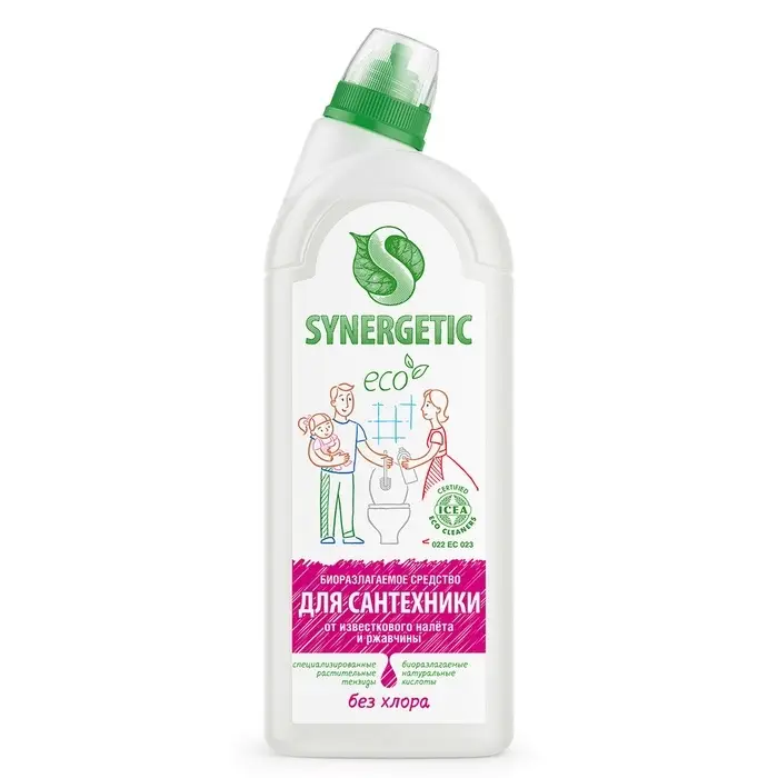 Биоразлагаемое универсальное средство для сантехники SYNERGETIC - концентрированное чистящее средство для ежедневной уборки поверхностей, устойчивых к кислотным моющим средствам, в ванных комнатах и санузлах: унитаза, раковины, ванны, душевой кабины, керамической плитки, акриловых, фаянсовых и эмалированных поверхностей.