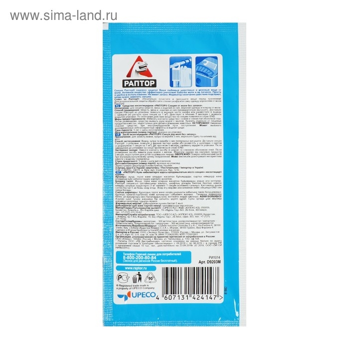 Секция пропитана действующим веществом – пиретроидом широкого спектра действия, который начинает выделяться после вскрытия упаковки, заполняя пространство шкафа, смешиваясь с молекулами воздуха.После достижения необходимой концентрации вещества наступает уничтожение взрослых особей, личинок и яиц моли, которые оказались внутри шкафа и на одежде. Кроме того частицы инсектицида создают защитный барьер для новых насекомых в течение 5 месяцев.Для стандартного двустворчатого вещевого шкафа потребуется 2-3 секции.Секции от моли содержит Vaportrin (вапортрин) – это современный высокоэффективный пиретроид контактного действия, который широко применяется для борьбы с взрослыми особями и личинками моли, а также с кожеедами. По уровню активности это вещество во многом превосходит другие высоколетучие пиретроиды, особенно сильна контактная инсектицидность вапортрина для бабочек и личинок моли. Чаще всего вапортрин применяют в составе долго действующих препаратов, обеспечивающих защиту за счет длительной фумигации. ИНСТРУКЦИЯАккуратно извлеките секцию из упаковки. Секцию следует повесить в верхней части шкафа, либо разместить в ящиках с одеждой (одна секция на 0,5 м³). Важно! Средство будет защищать вашу одежду от моли в течение 5 месяцев с момента вскрытия упаковки. В стандартном двустворчатом шкафу рекомендуется размещать не менее 2-3 секций. Для дополнительной защиты ваших вещей используйте также аэрозоль от моли РАПТОР