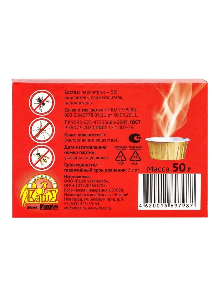 Состав: перметрин — 5%, окислитель, пламегаситель, наполнитель (тальк).