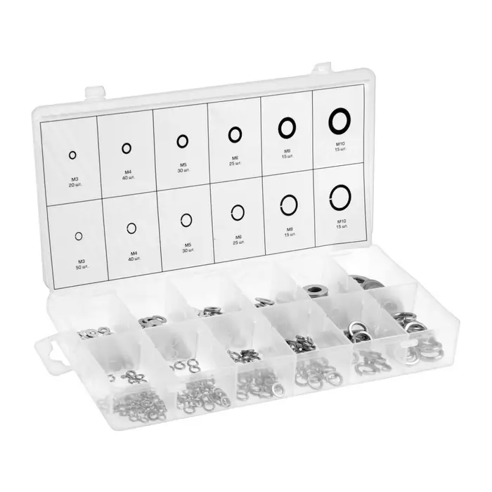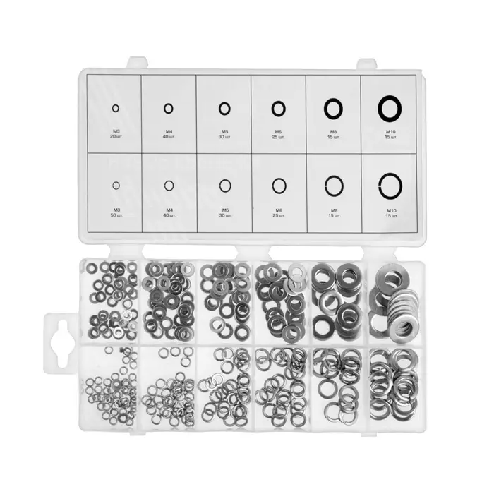 Шайбы плоские и пружинные, набор 350 шт.- Разнообразие типов: набор включает плоские и пружинные шайбы, подходящие для болтов, винтов и крепежа с различными нагрузками.
