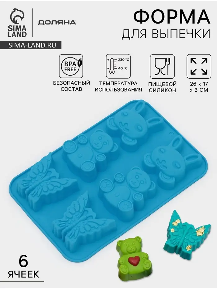 Форма для выпечки Доляна «Животные. Зоопарк», силикон, 26×17 см, 6 ячеек (7.2×6.4 см), МИКС