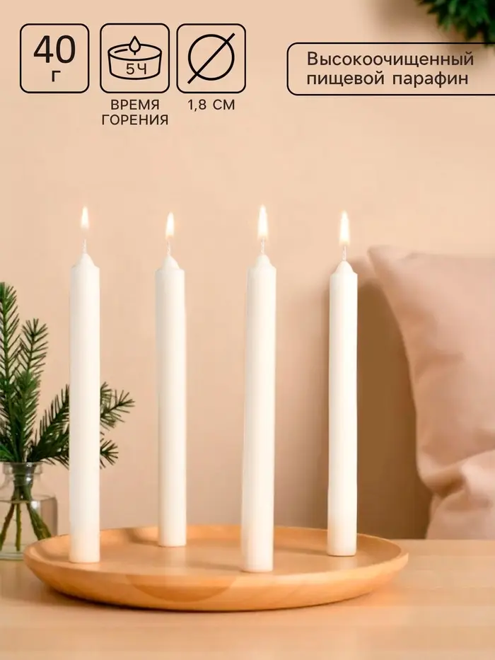 Каждая свеча обладает продуманными характеристиками: высотой 17,5 см, диаметром 1,8 см и массой 40 граммов. Благодаря этому они легко помещаются в подсвечники стандартного размера и обеспечивают стабильное горение на протяжении 5 часов. Парафиновый состав гарантирует чистое и равномерное сгорание без копоти и неприятных запахов.