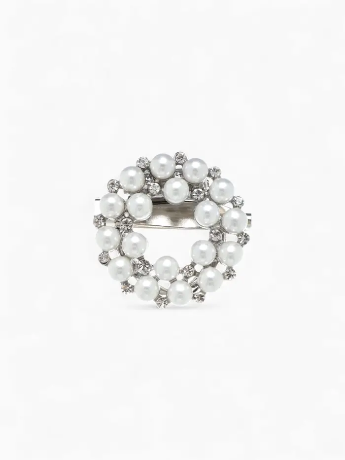 Изящный зажим для платка длиной 3 см сочетает в себе утонченность классики и современную элегантность. Металлическая основа с серебристым покрытием создаёт прочную и надёжную базу, а белая вставка из жемчуга в окружении аккуратных страз и пластика придаёт аксессуару лёгкость и изысканный блеск.