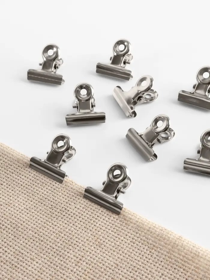 Эти серебристые зажимы — ваш надёжный помощник для точной и аккуратной работы с тканью. Они крепко фиксируют слои материала, не оставляя следов и не повреждая даже деликатные ткани. С ними вы легко совмещаете детали выкройки, контролируете припуски и организуете рабочее пространство.