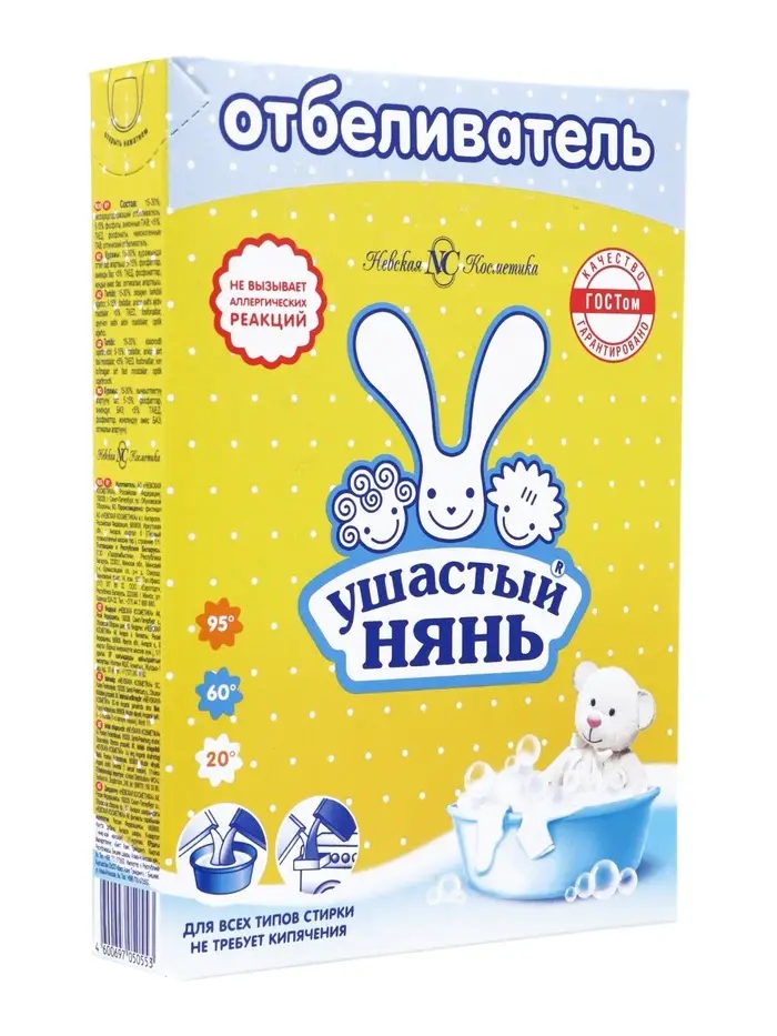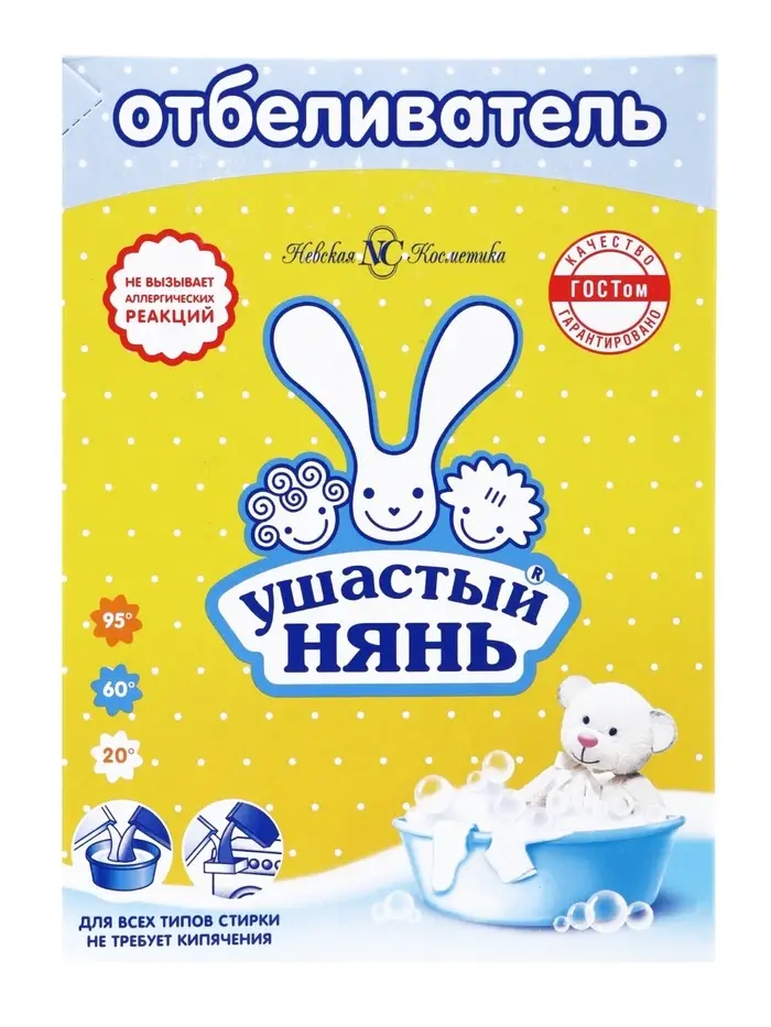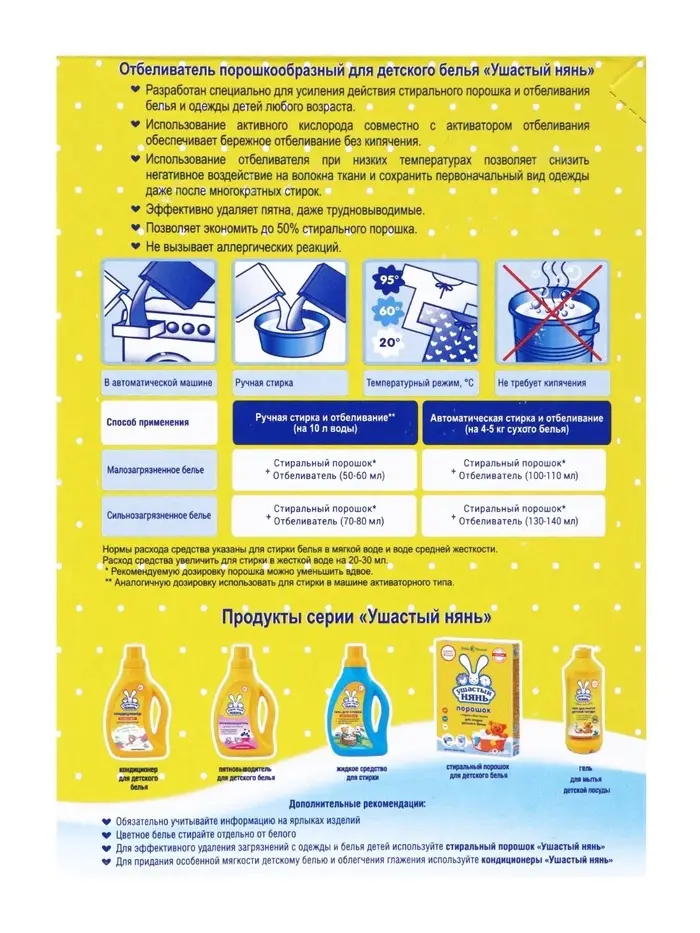 Отбеливатель «Ушастый нянь» усиливает действие стирального порошка при выведении пятен с одежды детей любого возраста, в том числе новорожденных. Он прекрасно работает без кипячения при низких температурах и сохраняет первоначальный вид вещей даже после многократных чисток.