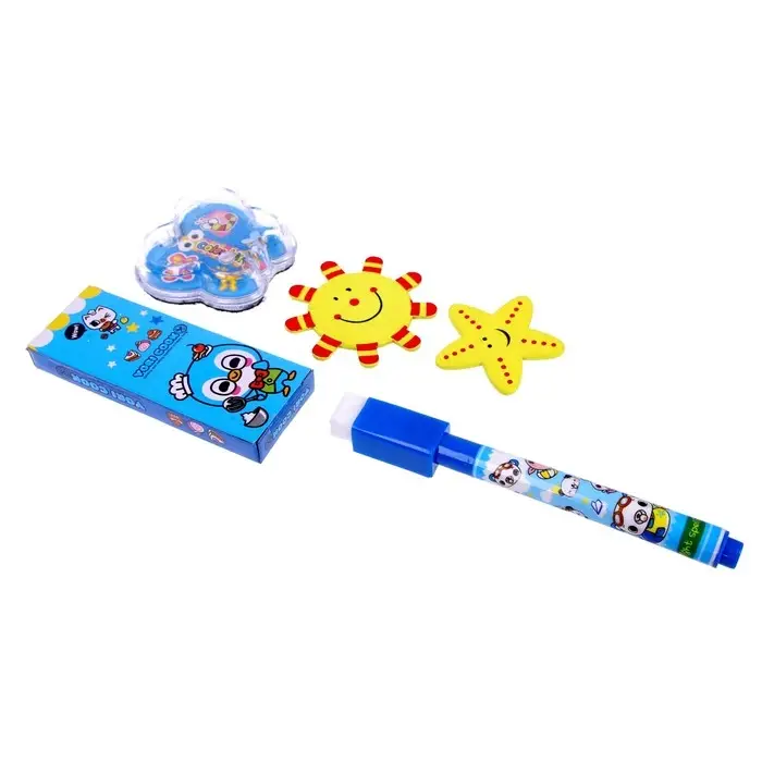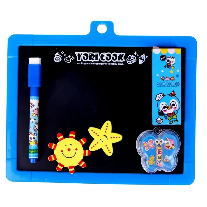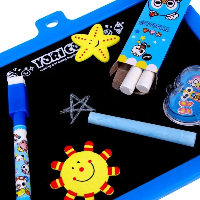 - Комплект расходных материалов: сухостираемый маркер, три цветных мелка, две магнитные фигурки и губка.