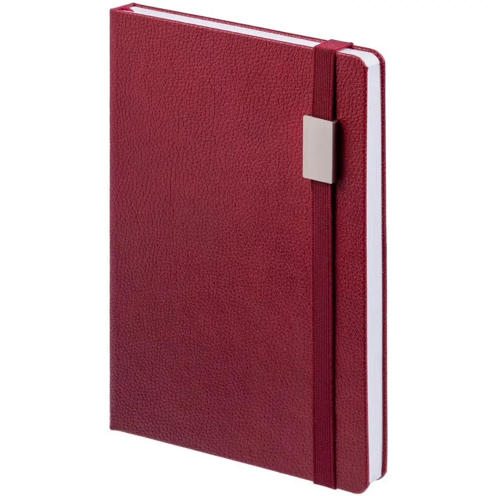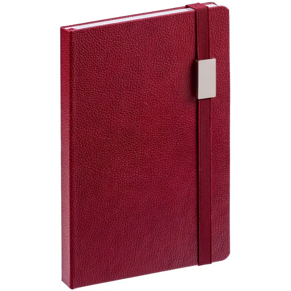 Зауженный ежедневник с прямоугольным металлическим шильдом на резинке.