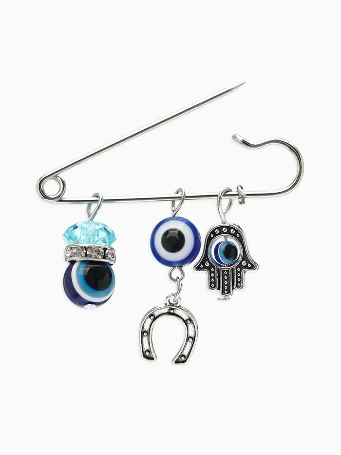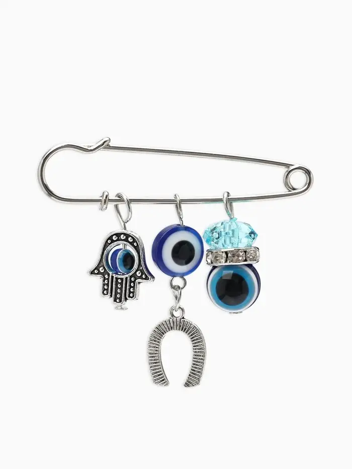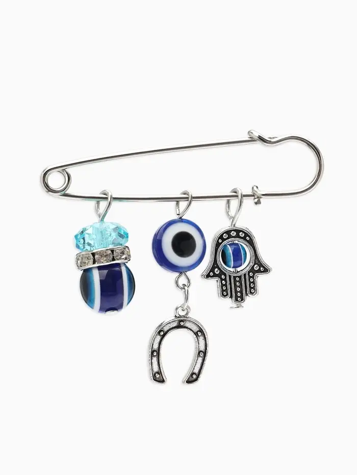 Откройте для себя изысканный аксессуар, который станет не только стильным дополнением вашего образа, но и мощным оберегом — булавку с тремя подвесками в виде руки Хамса и подковы. С длиной 5 см и в элегантном синем цвете с серебряной фурнитурой, она привнесёт нотку утончённости и защиты в повседневную жизнь.