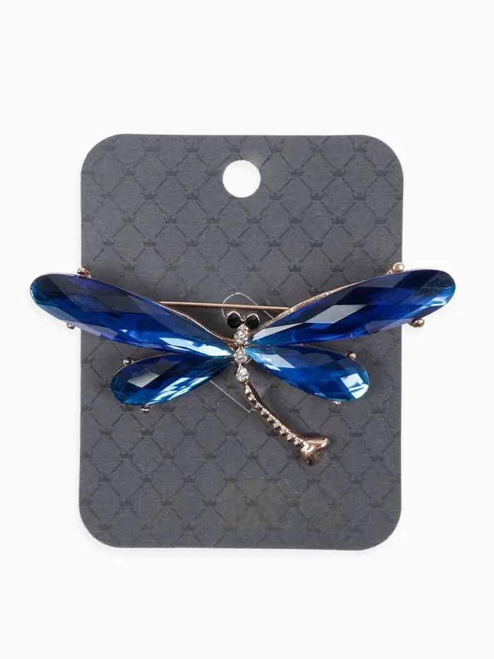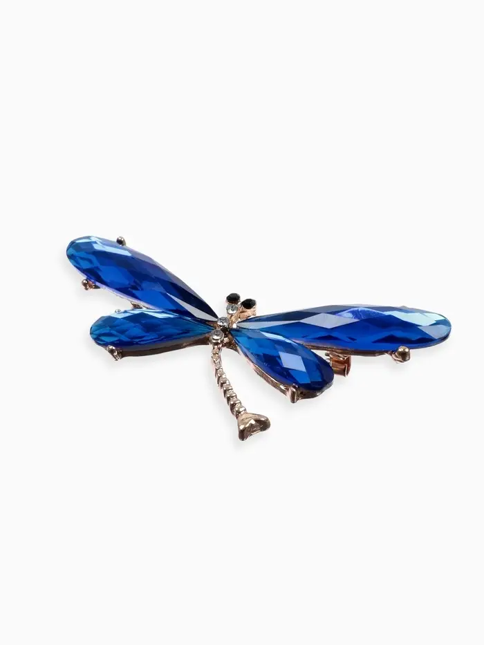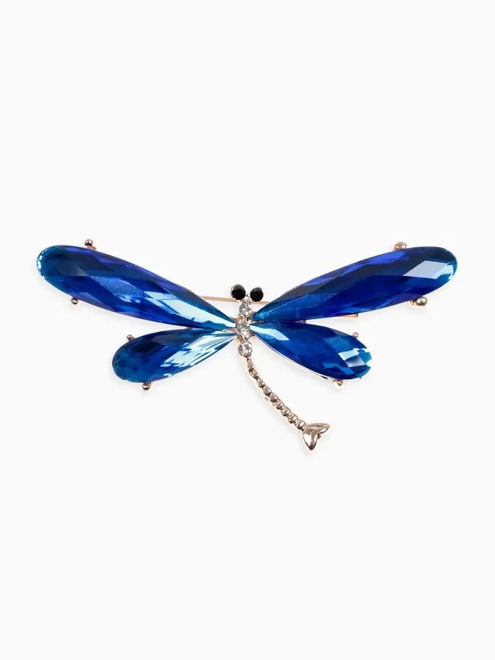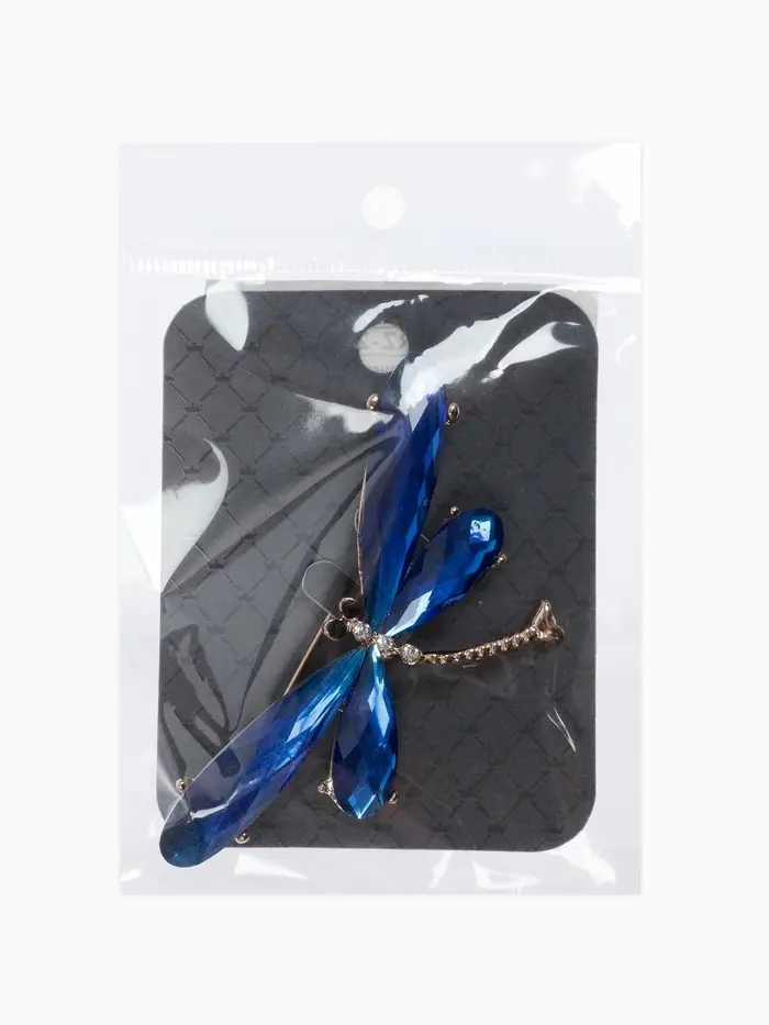 Изысканная брошь в форме стрекозы с гранёными синими крыльями на золотой основе — это настоящее украшение для тех, кто ценит утончённость и яркость в деталях. Эффектное сочетание глубокого синего цвета и блеска страз создаёт впечатление лёгкости и воздушности, словно стрекоза вот-вот взлетит.