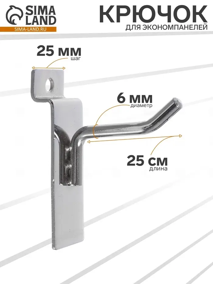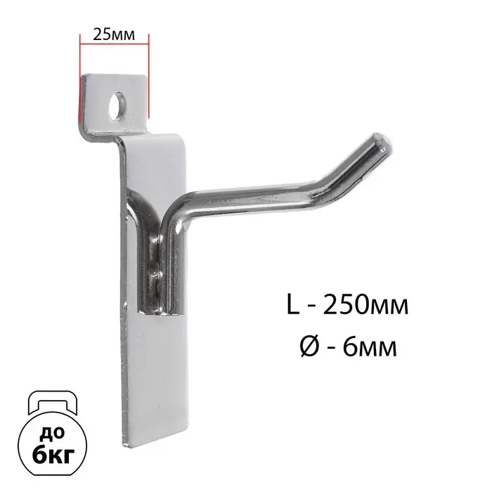 Металлический крючок с хромированным покрытием и длиной 25 см предназначен для использования с перфорированными панелями. Диаметр 6 мм обеспечивает прочность и устойчивость при нагрузках до 6 кг. Серебристый оттенок гармонично вписывается в любые интерьерные и торговые решения.