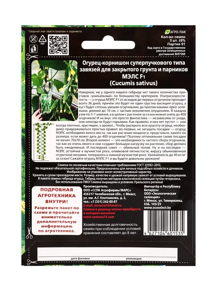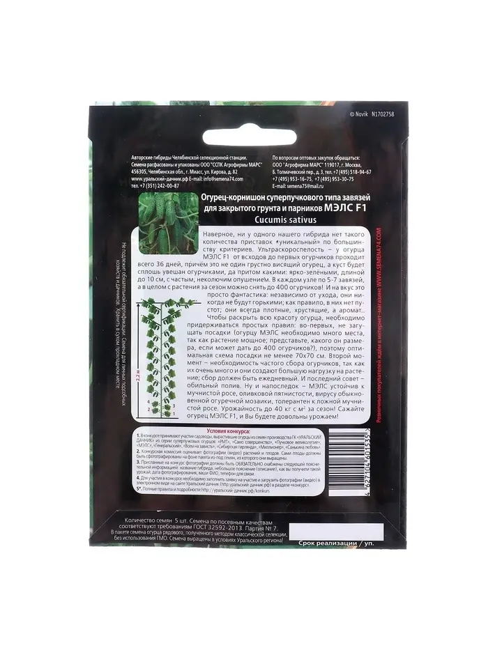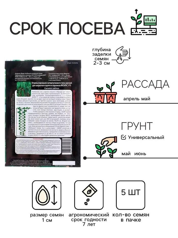 Семена огурец корнишон «Мэлс», F1, партенокарпический, 5 шт., «Уральский дачник»