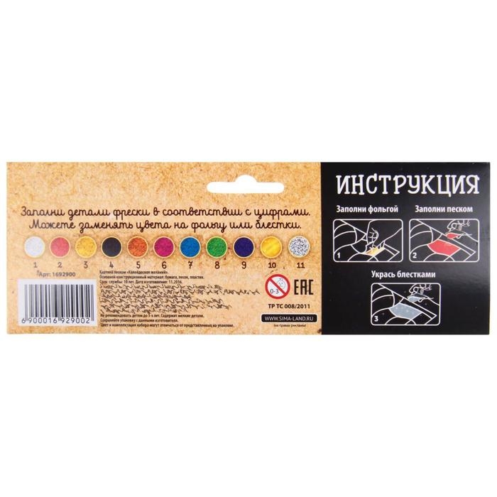 Отделяйте поочерёдно защитный слой деталей изображения, засыпайте основу песком нужного цвета и добавляйте блёстки. Элементы рисунка также можно заполнять фольгой из набора.
