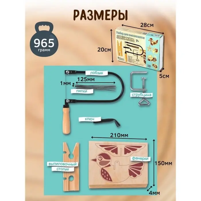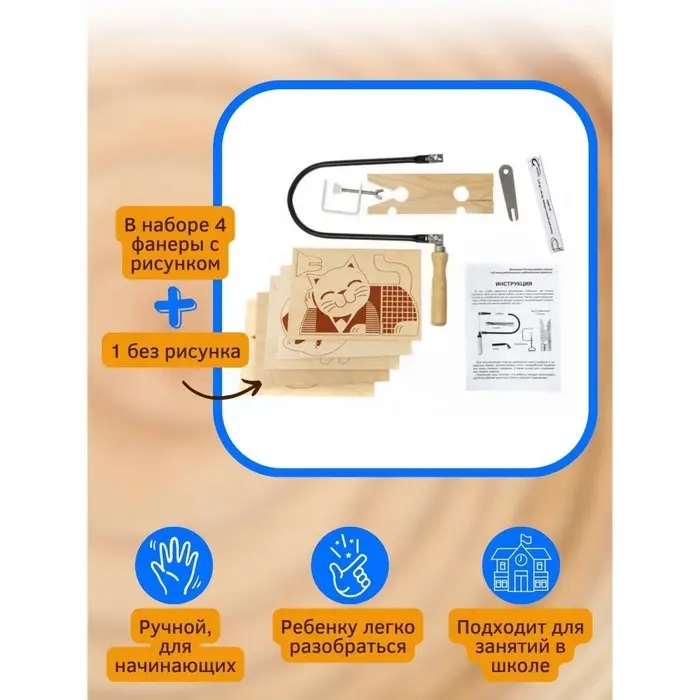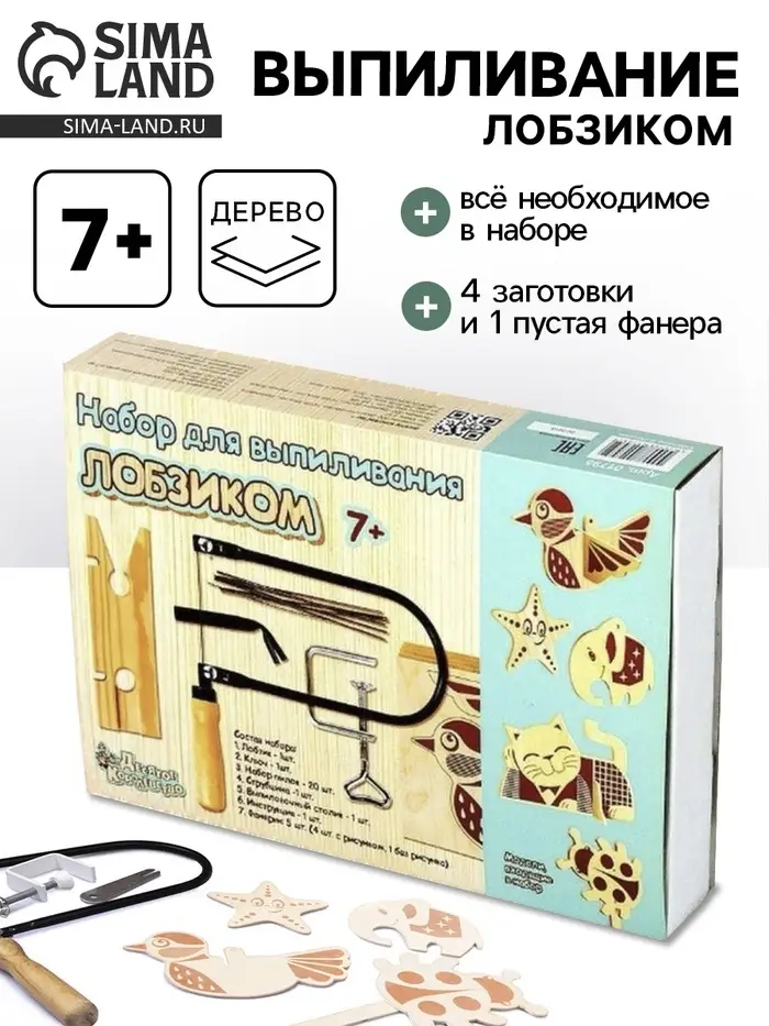 - В наборе есть все необходимое для выпиливания: лобзик, ключ, выпиловочный столик, струбцина и набор пилок и т. д., что позволяет сразу приступать к работе.