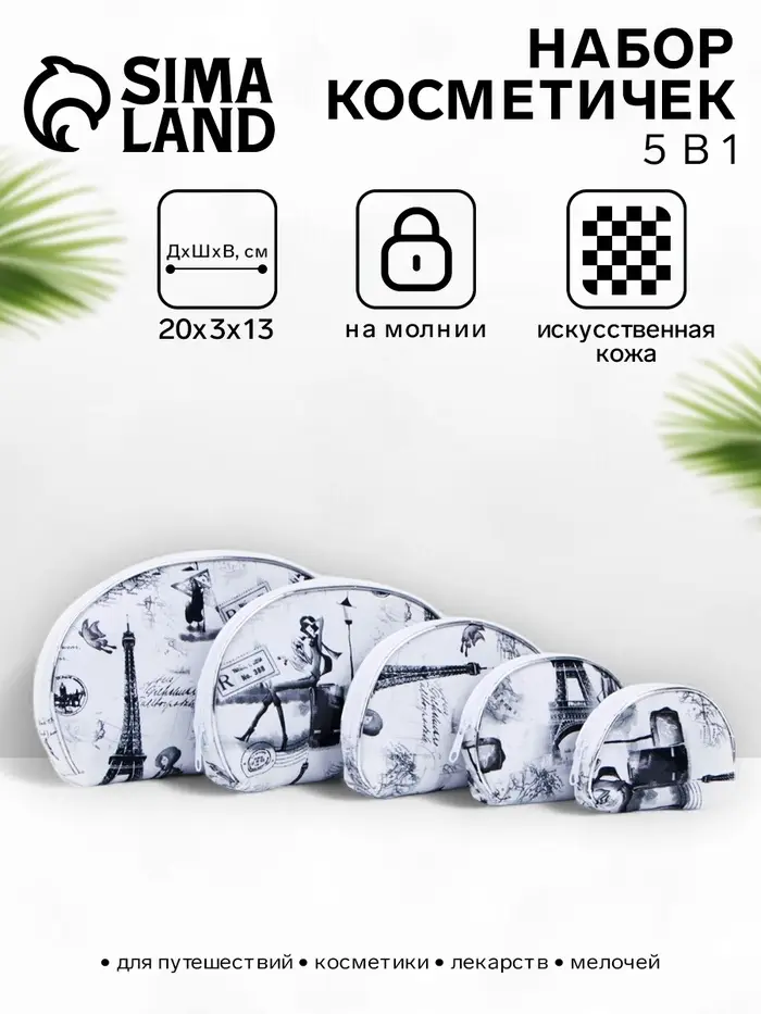 Набор из пяти серых косметичек с архитектурным принтом — это продуманная система для идеального порядка. Все мелочи теперь на своих местах: от повседневной помады и теней до кистей и флакончиков с любимым ароматом. Каждая из пяти сумок-органайзеров служит для своей категории вещей, помогая быстро собрать нужную косметику дома, в дорогу или в спортзал.
