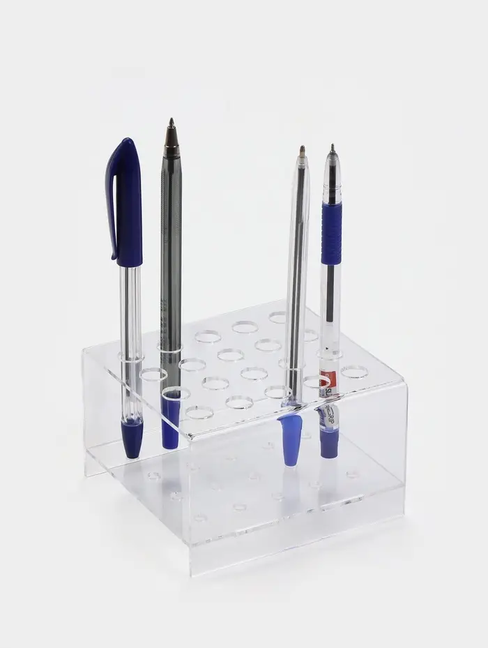 Обустройте рабочее место стильно и удобно с помощью прозрачной подставки для двадцати ручек и карандашей. Изготовленная из прочного оргстекла толщиной 2 мм, подставка обеспечит аккуратное хранение и легкий доступ к пишущим принадлежностям, помогая держать стол чистым и ухоженным. Единая открытая конструкция вмещает инструменты разных диаметров и длины, что позволяет забыть о проблемах поиска потерянных карандашей и ручек.