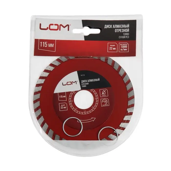 Отрезной алмазный диск TURBO, диаметр 115 мм, посадочное отверстие 22 мм — оснастка для резки камня, бетона и кирпича. Применяется с угловыми шлифовальными машинами (болгарками) для сухой резки. Сегментированный TURBO-профиль ускоряет работу и отводит пыль. Толщина диска 2 мм обеспечивает чистый рез. В комплекте переходные кольца для посадки на разные валы.