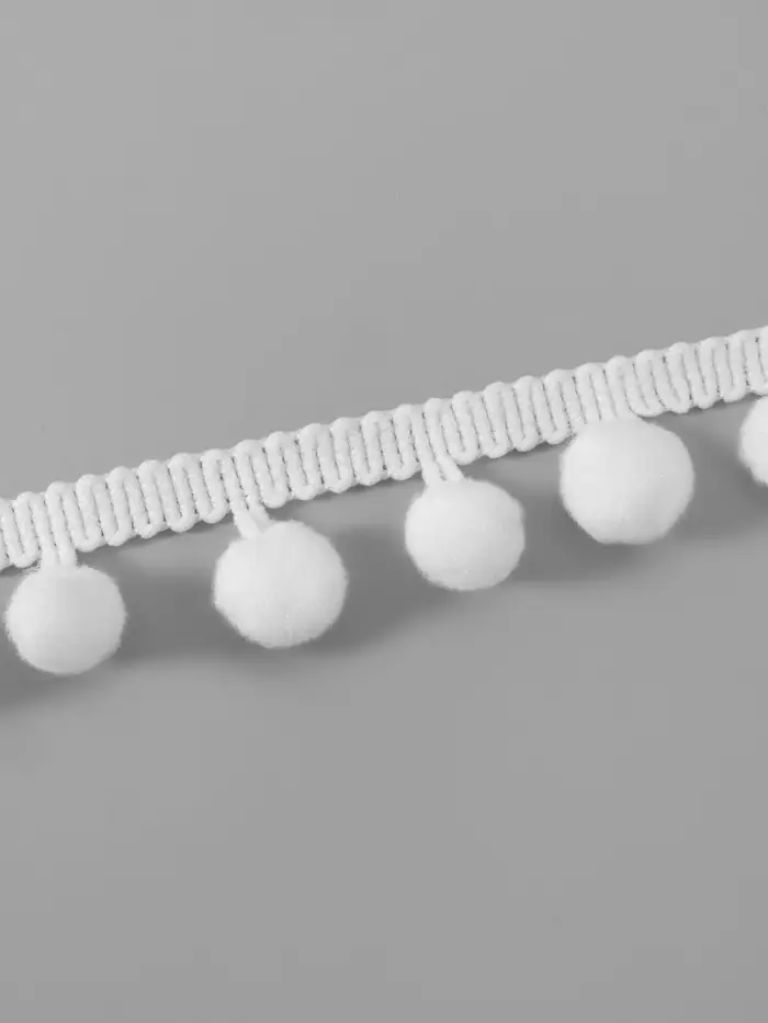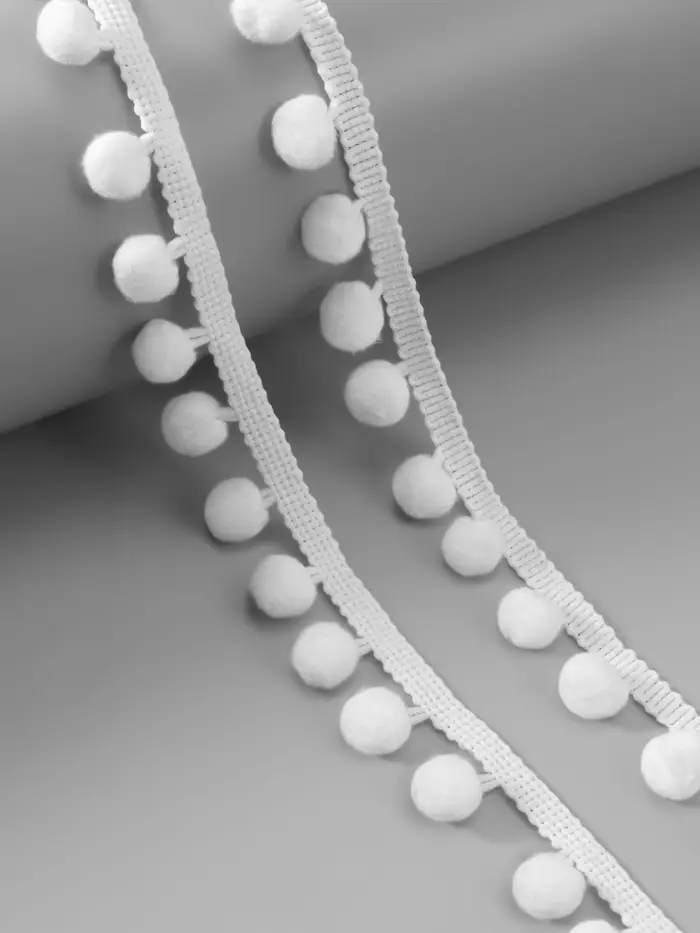 Белая декоративная тесьма с помпонами — это лёгкий способ добавить текстуру и объём. Она превращает обычные вещи в уютные и нарядные. Проведите её по краю полки, обрамите зеркало или украсьте подушки — интерьер сразу станет теплее и живее.