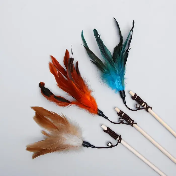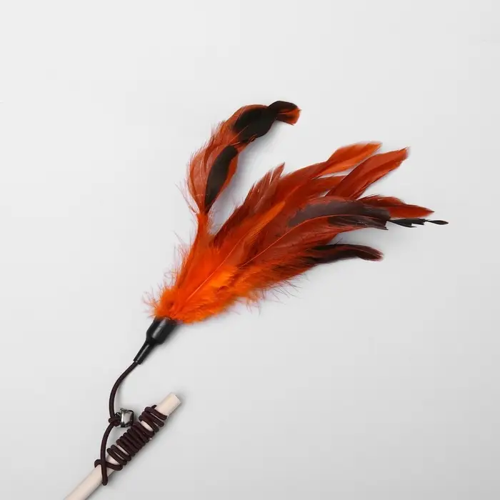 - Перышки и бубенчик — двойной стимул: воздушные движения перьев имитируют птицу, а мягкий звон привлекает внимание даже самой спокойной кошки.