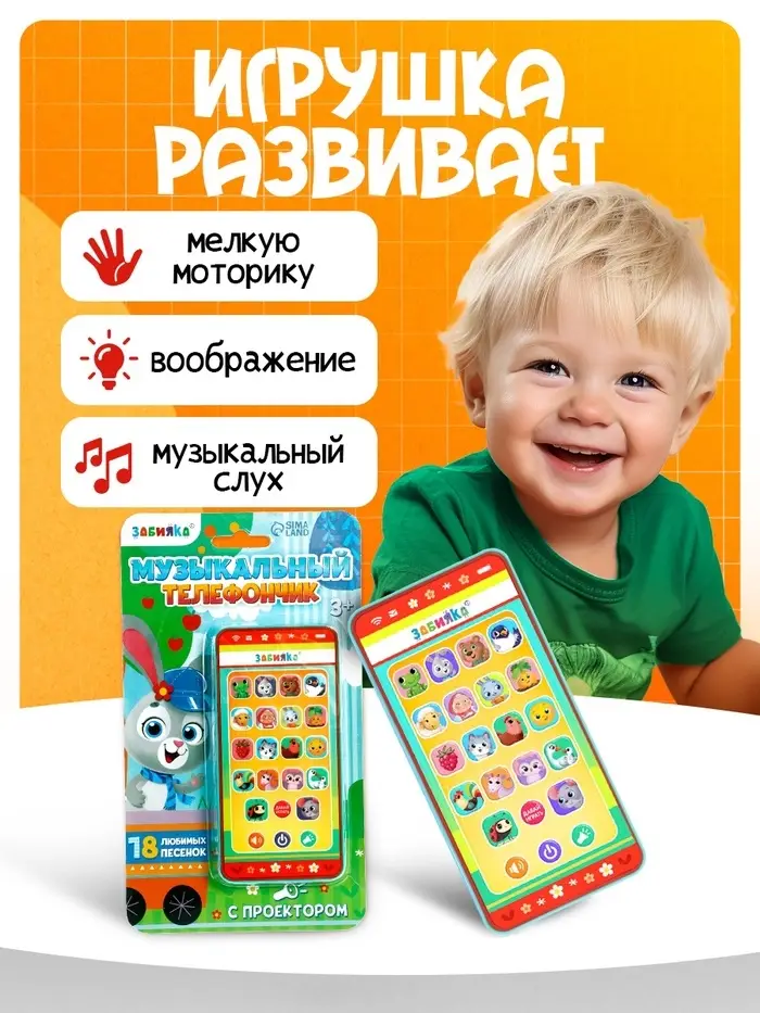 Включив телефончик, малыш сможет послушать весёлые песенки по мотивам известных русских народных сказок и потешек, познакомиться с героями. Все они перечислены на упаковке игрушки. Включайте чудо-проектор, смотрите картинки и развивайте воображение вместе с ребёнком.