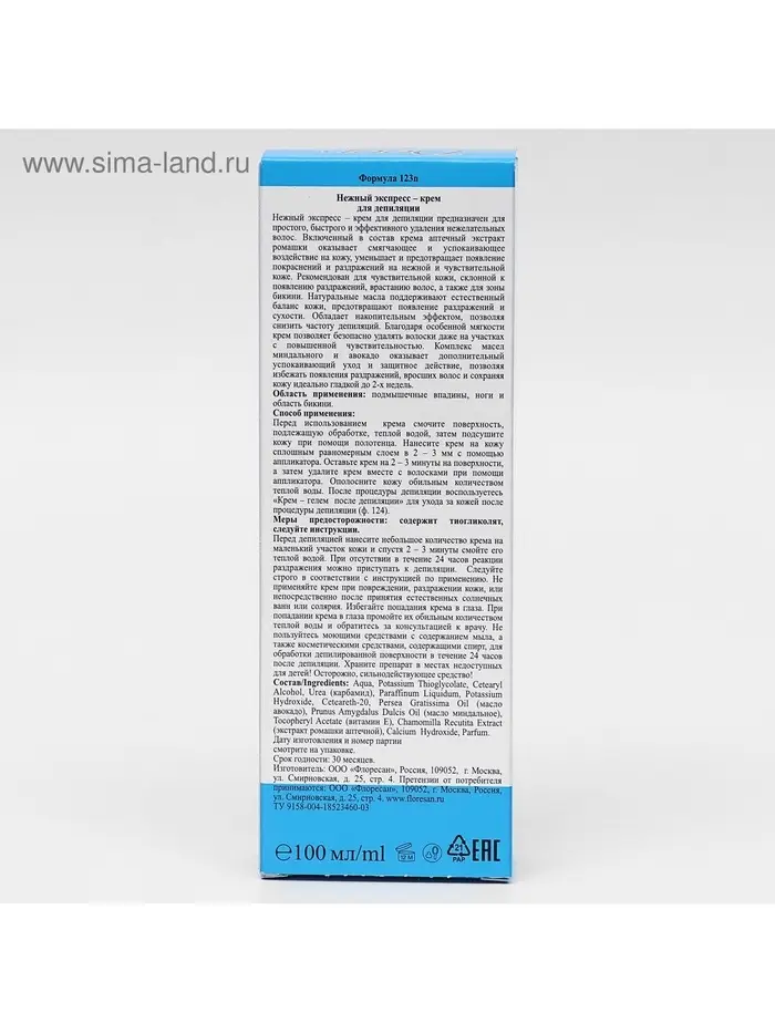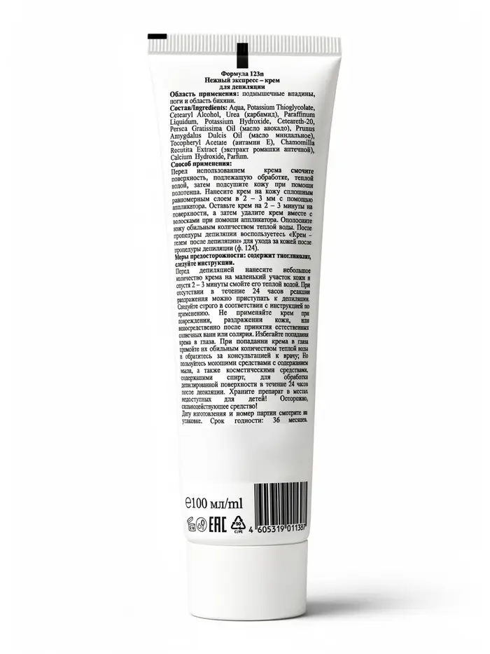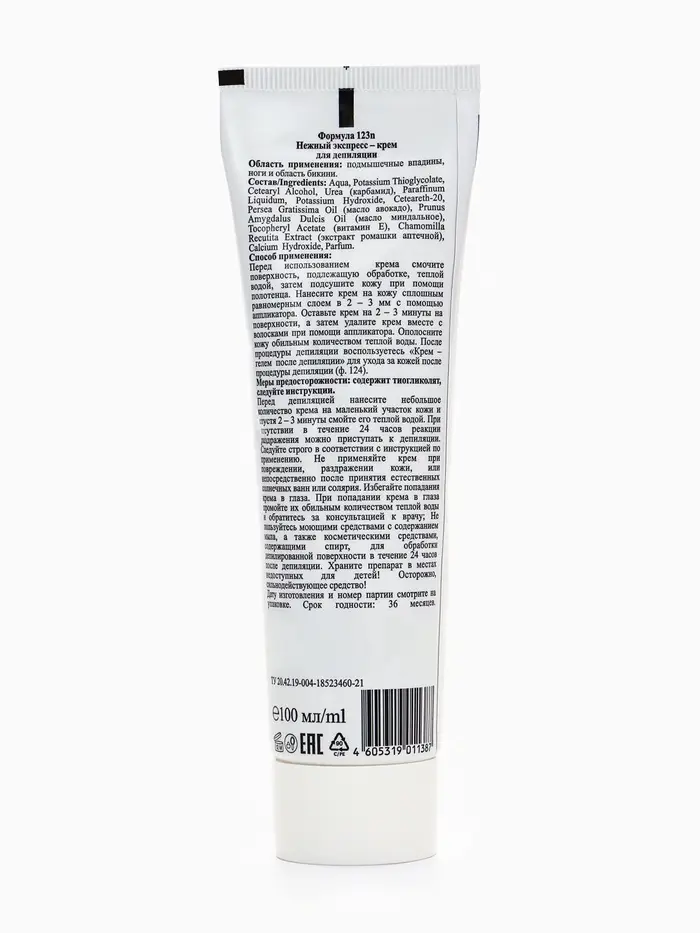 Перед депиляцией нанесите небольшое количество крема на маленький участок кожи и спустя 2 – 3 минуты смойте его теплой водой. При отсутствии в течение 24 часов реакции раздражения можно приступать к депиляции.