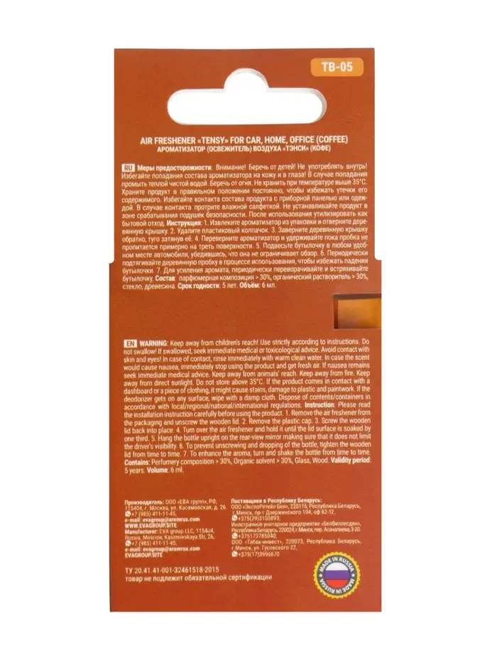 Подвесной ароматизатор TENSY в стеклянной бутылочке со стильным вощенным шнурком удобно использовать в автомобиле. Благодаря массивной деревянной крышке из натурального бука аромат плавнее и дольше передаётся в салоне, эффективно устраняя неприятные запахи. Для усиления аромата периодически переворачивайте флакон в закрытом состоянии и слегка пропитывайте крышку ароматической жидкостью. Ароматизатор эффективно устраняет неприятные запахи в салоне автомобиля, наполняя его бодрящим ароматом кофе с нотками натуральных компонентов и специй. Поможет создать уютную атмосферу и поднять настроение.