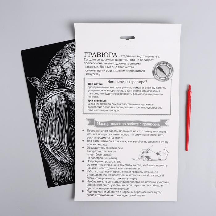 Гравюра представляет собой многослойное панно, покрытое чёрной краской, на которое нанесён контур рисунка. С помощью особого скребка (штихеля), который входит в набор, путём процарапывания и создается гравюра. Новая серия с уникальным дизайном порадует вас разнообразием рисунков.
